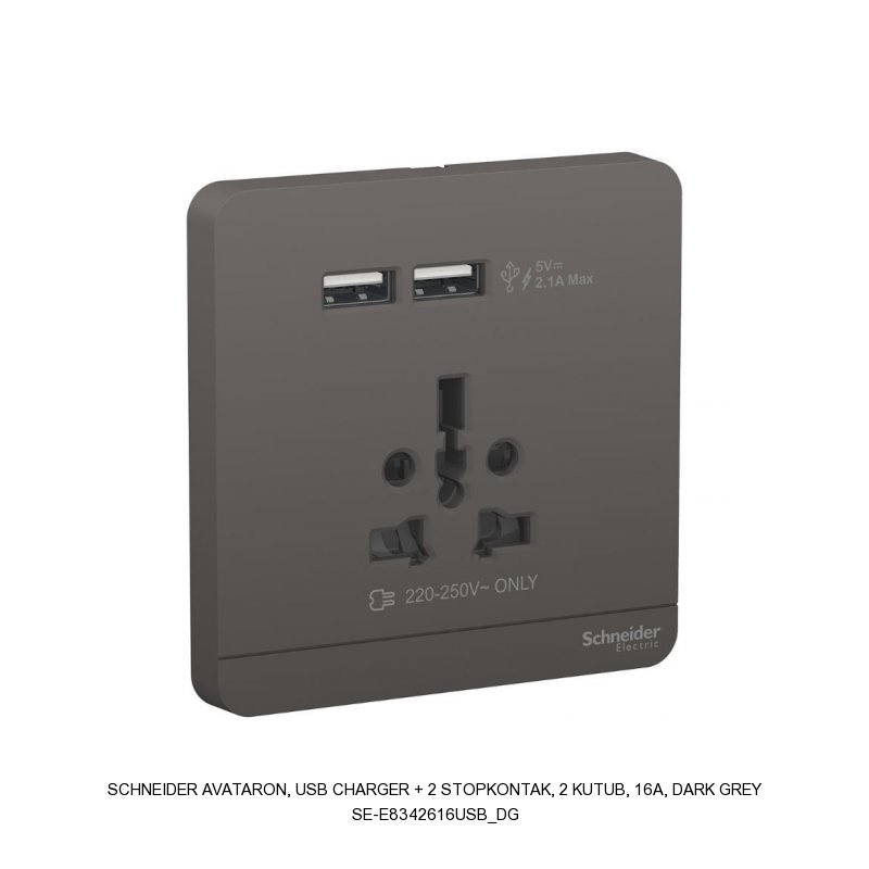 AvatarOn, USB charger + 2 stopkontak, 2 kutub, 16A, dark grey